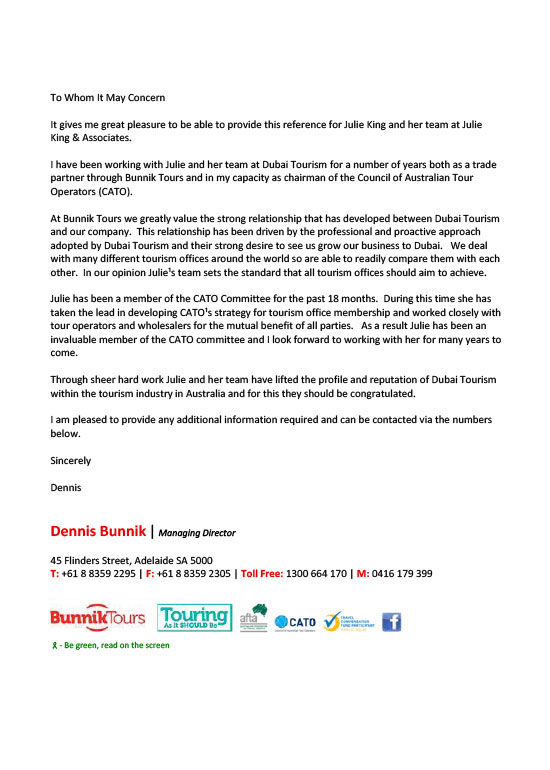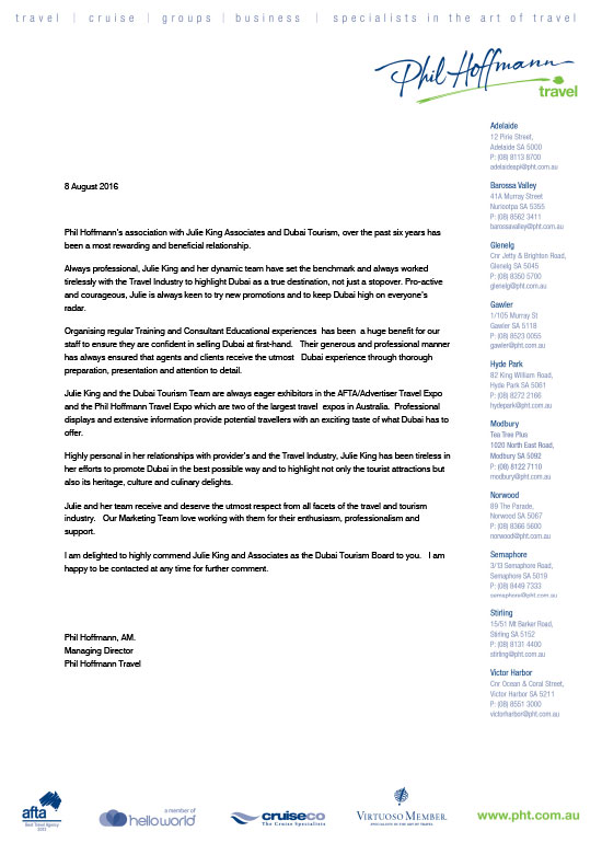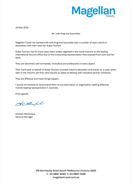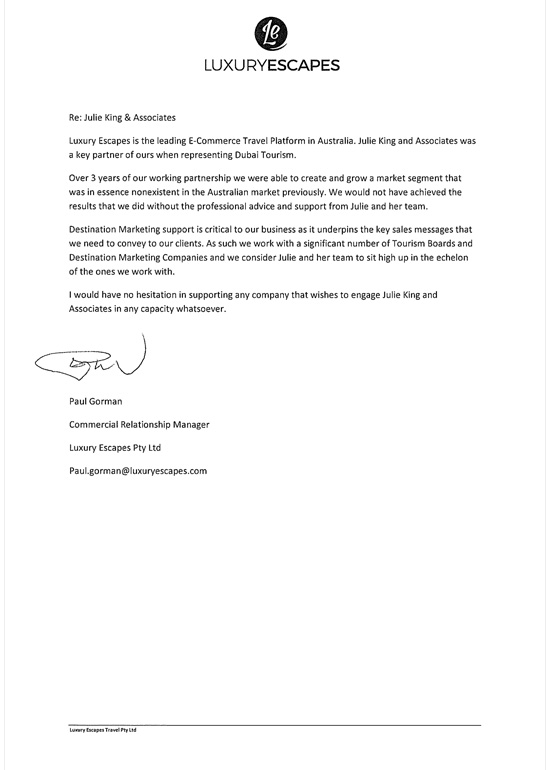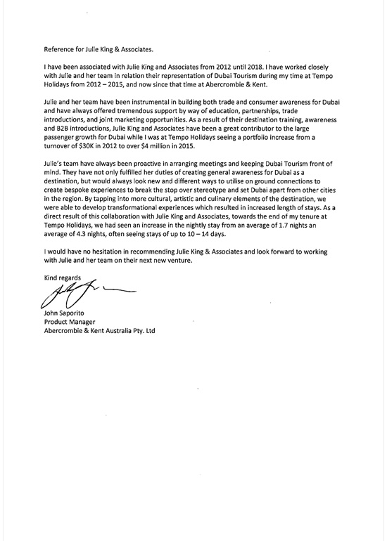 "I have worked with Julie King and Associates in the industry for the last 6 years and have found Julie and the team reputable - Julie is very involved within the overall travel industry at large and built their amazing reputation on the work they have done building the Dubai's profile in the market place, this was due to the connectivity that they have had with the tourism industry."
