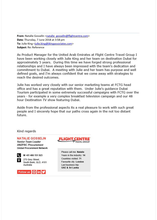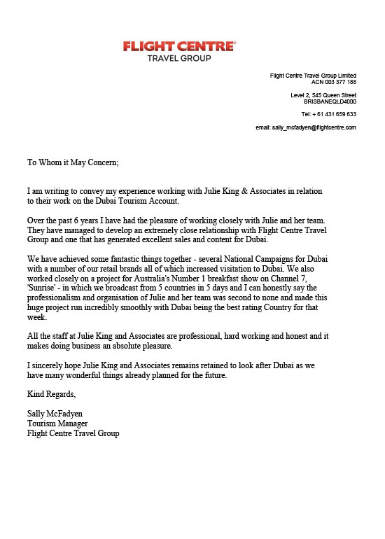"As Product Manager for the United Arab Emirates at Flight Centre Travel Group I have been working closely with Julie King and her team on destination Dubai for approximately 5 years. During this time we have forged strong professional relationships and I have always been impressed with the team's dedication and commitment to Dubai. A meeting with Julie and her team has purpose and well defined goals, and I'm always confident that we come away with strategies to reach the desired outcomes. Julie has worked very closely with our senior marketing teams at FCTG head office and has a great reputation with them. Under Julie's guidance Dubai Tourism participated in some extremely successful campaigns with FCTG over the years - for example a very complex breakfast television campaign and our 48 hour Destination TV show featuring Dubai. Aside from the professional aspects its a real pleasure to work with such great people and I sincerely hope that our paths cross again in the not too distant future."