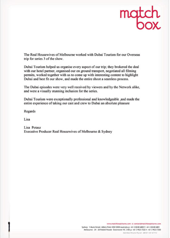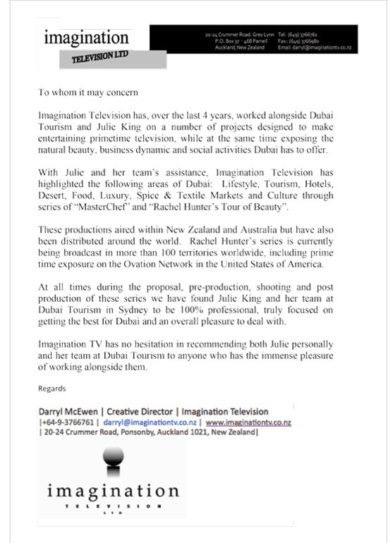 "At all times during the proposal, pre-production, shooting and post production of these series we have found Julie King and her team at Dubai Tourism in Sydney to be 100% professional, truly focused on getting the best for Dubai and an overall pleasure to deal with"