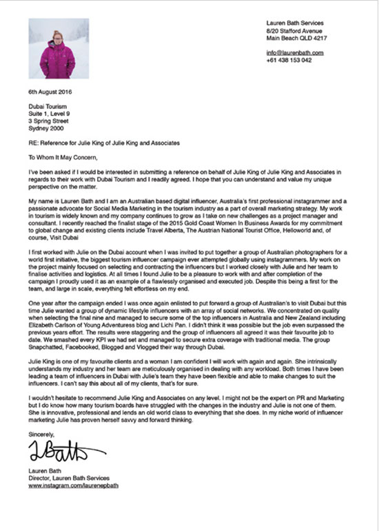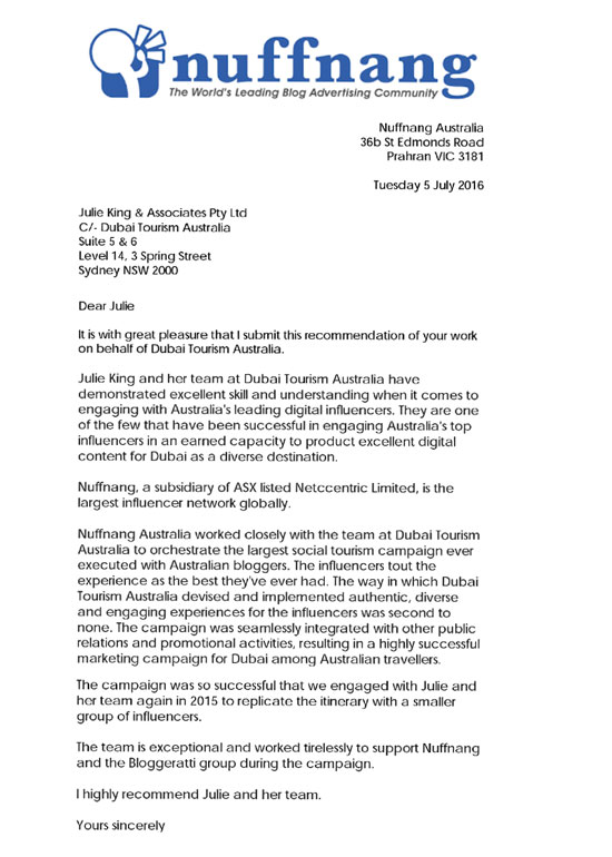 "Julie King and her team at Dubai Tourism Australia have demonstrated excellent skill and understanding when it comes to engaging with Australia's leading digital influencers. They are one of the few that have been successful in engaging Australia's top influencers in an earned capacity to product excellent digital content for Dubai as a diverse destination.