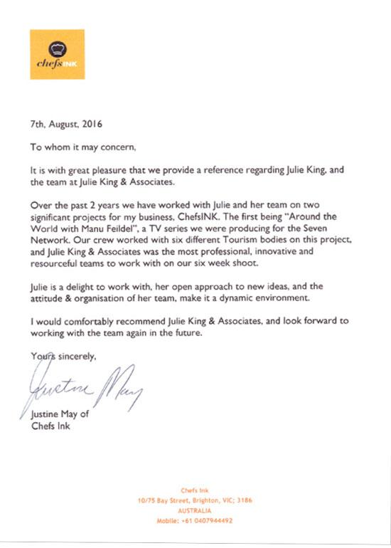 "Julie King is one of my favourite clients and a woman I am confident I will work with again and again. She intrinsically understands my industry and her team are meticulously organised in dealing with any workload. She is innovative, professional and lends an old world class to everything that she does. In my niche world of influencer marketing Julie has proven herself savvy and forward thinking”