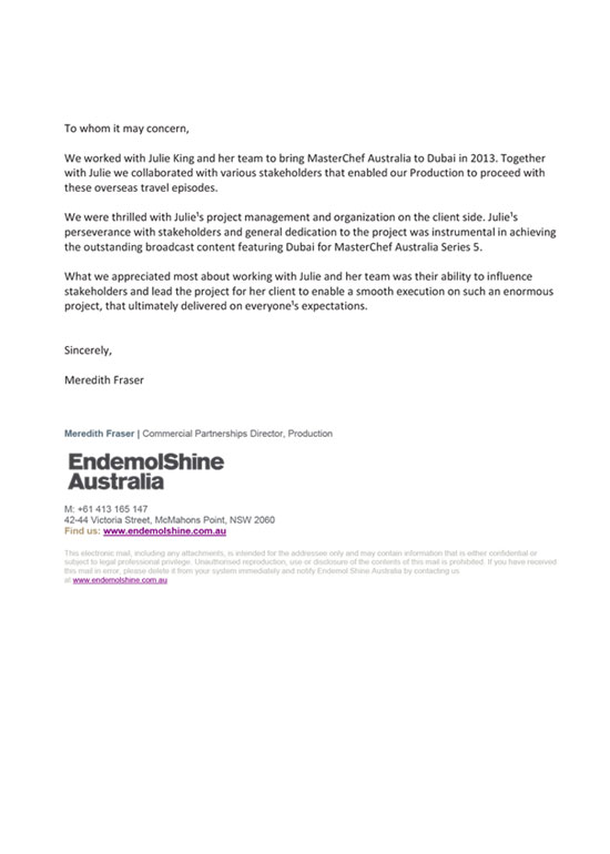"We were thrilled with Julie’s project management and organization on the client side. Julie’s perseverance with stakeholders and general dedication to the project was instrumental in achieving the outstanding broadcast content featuring Dubai for MasterChef Australia Series 5.