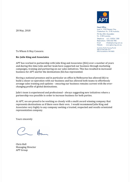 "Julie’s team is experienced and professional - always suggesting new initiatives where a partnership was possible in order to increase business for both parties. At APT, we are proud to be working so closely with a multi award winning company that represents destinations as if there were their own. I would recommend Julie King and Associates very highly to any company seeking a trusted, respected and results orientated representation company. "