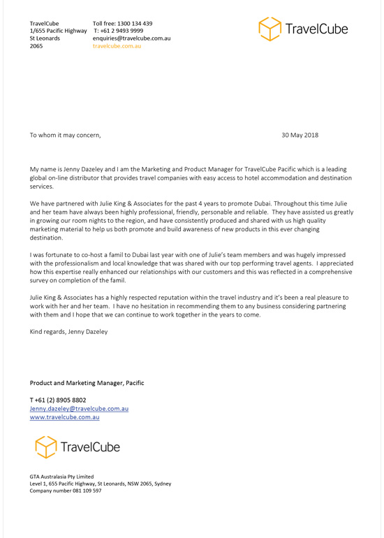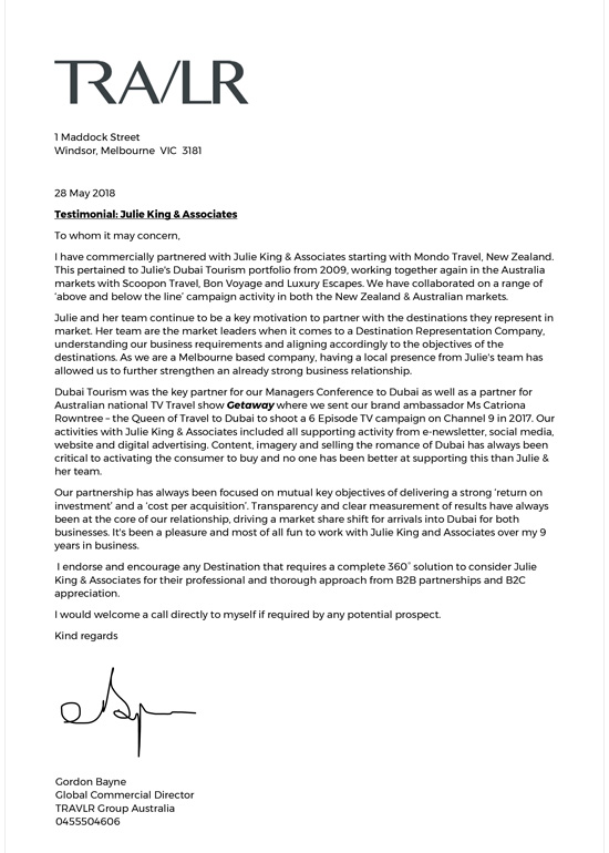 "Julie and her team have been instrumental in building both trade and consumer awareness for Dubai and have always offered tremendous support by way of education, partnerships, trade introductions, and joint marketing opportunities. As a result of their destination training, awareness and B2B introductions, Julie King and Associates have been a great contributor to the large passenger growth for Dubai while I was at Tempo Holidays seeing a portfolio increase from a turnover of $30K in 2012 to over $4 million in 2015 and an increase in the nightly stay from an average of 1.7 nights an average of 4.3 nights, often seeing stays of up to 10 – 14 days."